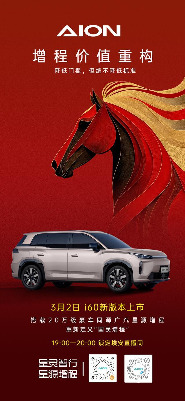 [懂车帝原创 产品] 日前,我们从官方获悉,埃安AION i60将于3月2日加推增程新版本,或将命名为马到成功版。新车将搭载广汽星源增程动力,匹配1.5升增程器。官方表示,新车售价将降低门槛。作为参考,现款埃安AION i60增程版的起售价为10.98万元。